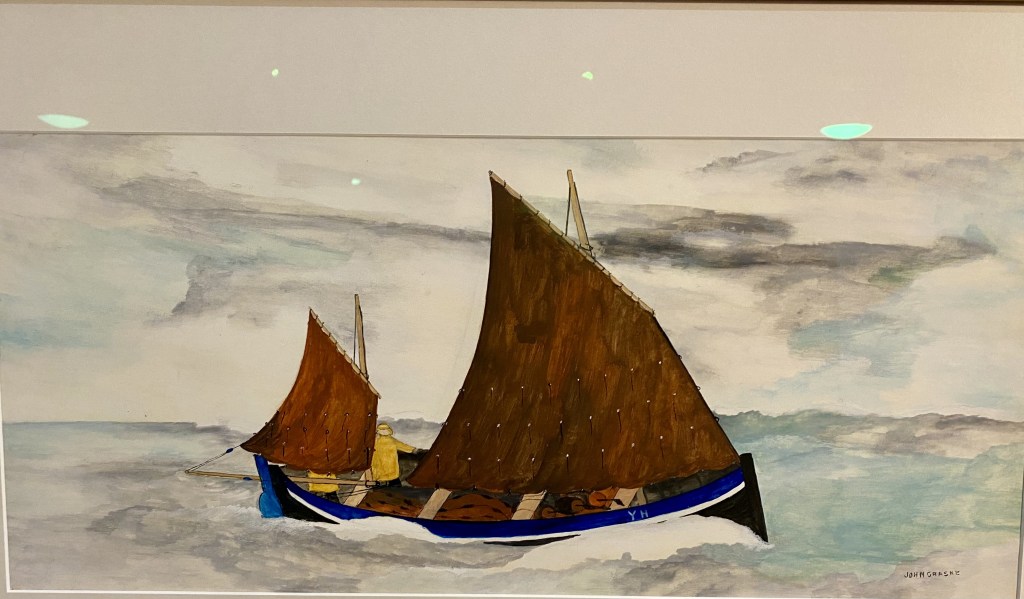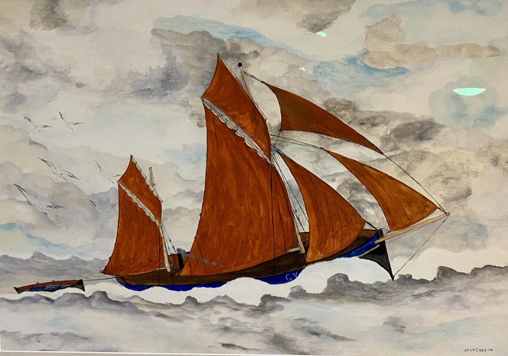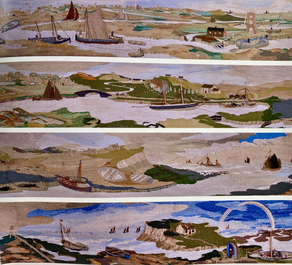 There are also a couple of Craskes on display at the the Glandford Shell Museum near Blakeney. The Shell museum is unlike any other museum, you’ll ever find. Housed in a lovely old Norfolk building, it has, as you would expect shells by the thousand, but also many other items of interest, including fossils, archeological finds and much more, a true museum of curiosities. And, of course there are the Craskes. There is a lovely watercolour of a schooner listing in heavy seas, and a stunning panoramic embroidery of the coast, bringing to life, from John’s memory, the time that he had spent sailing there after his illness. A true Tour De Force.