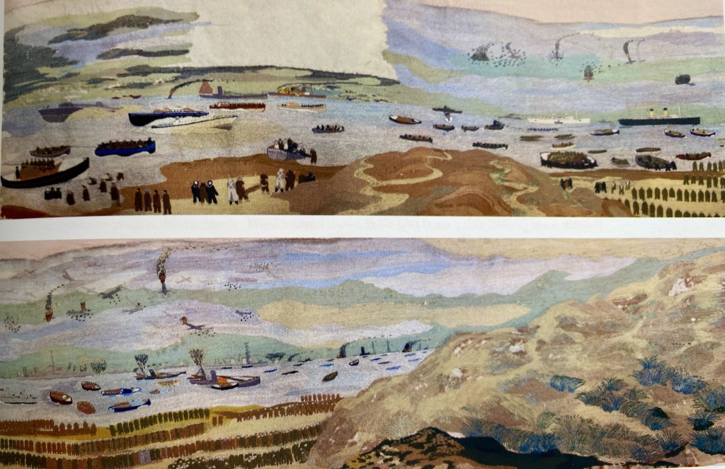 Even more extraordinary, was an embroidery which Craske was working on towards the end of his life between 1940 and 1943 depicting the retreat at Dunkirk. This monumental work, a modern day Bayeux tapestry, based purely on radio reports and photographs, shows a world of mayhem and terror as men queued up on the beaches to be rescued. Craske had moved from depictions of life at sea into a mythic realm and had become a storyteller in wool. This work was unfinished when he died and is now in the possession of Norwich Museum.