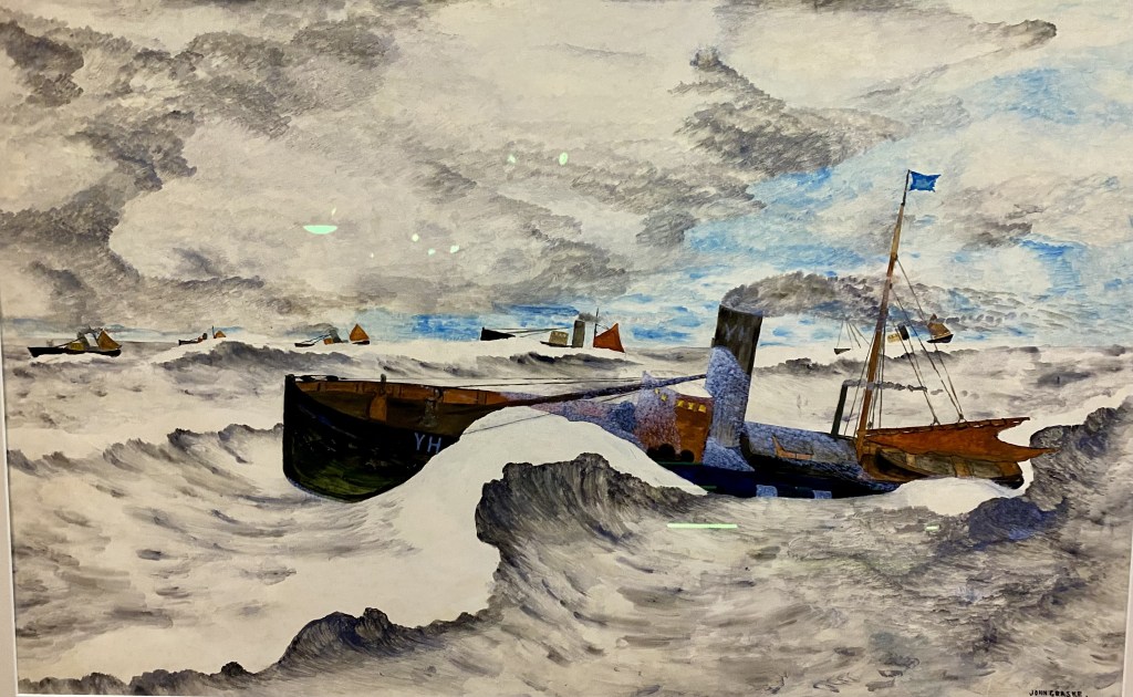 Looking at all this material in one place is very enlightening, the early sea paintings, in a limited colour palette, are very moving and give an incredible feel of how it feels to be out in rough seas, with the pitching and tossing of the waves. It is difficult to believe that Craske was a totally self taught artist, together the extraordinary fact that these paintings are based purely on his memories of being at sea.