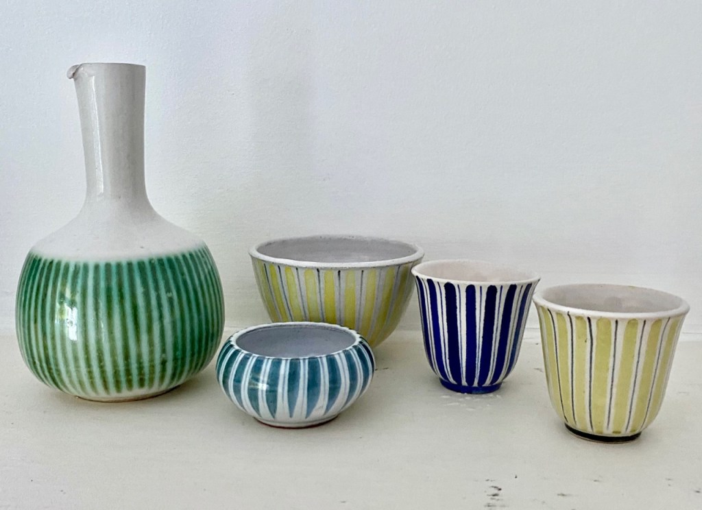 However, once restrictions were lifted, Rye started producing a variety of shapes and patterns that tuned into the optimism of the times, epitomised by the Festival of Britain in 1951, with people wanting to put the horrors of the Second World War behind them. The Cole brothers employed a number of people to produce the pottery and took on a number of apprentices many of whom such as David Sharp, Denis Townsend and Raymond Everett went on to start their own potteries in Rye. Examples of the many types of wares and patterns produced by Rye Pottery in the nineteen fifties can be seen below.