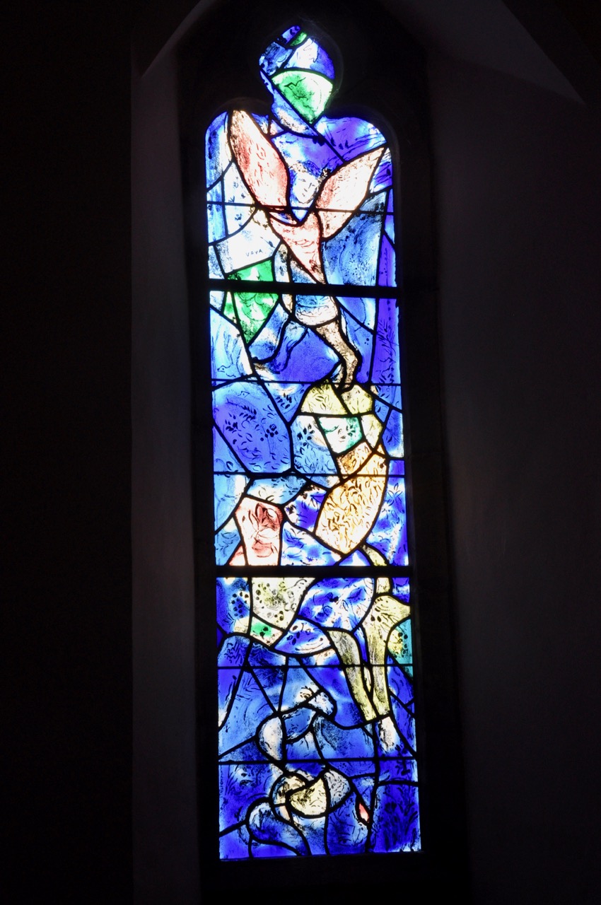 On display, of course, was sublime art from from of the towering giants of 20th century post-impressionism, Marc Chagall. The largest window above the altar is an mainly intense blues, with patches of yellow, red and green. It shows the crucified Jesus at the top with the Virgin Mary in the lower right hand corner and then a number of typical Chagall angels floating around at the edges and, of course, a Chagall donkey.