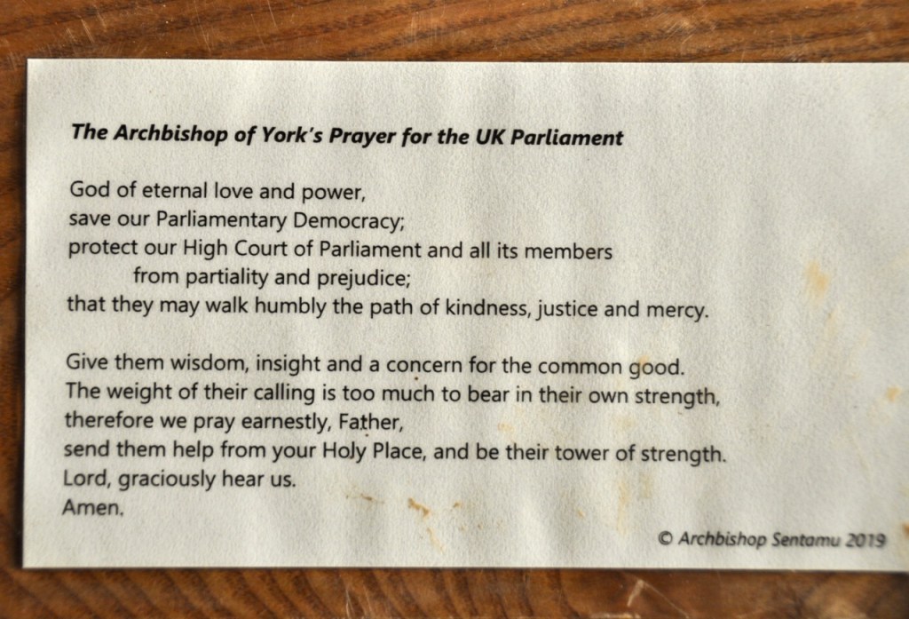 As an aside, on the way out, I noticed a prayer stuck to one of the front pews. It was written by Archbishop Sentanu, then Archbishop of York and was written as the Government was still negotiating the Brexit withdrawal agreement.