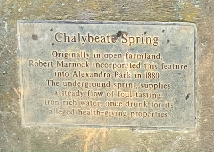 There is a plaque, which states that the Chalybeate Spring was “originally in open farmland, Robert Marnock incorporated this feature into Alexandra Park in 1880. The underground spring supplies a steady flow of foul iron-rich water once drunk for its alleged health-giving properties.”
