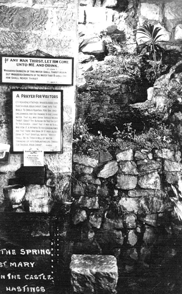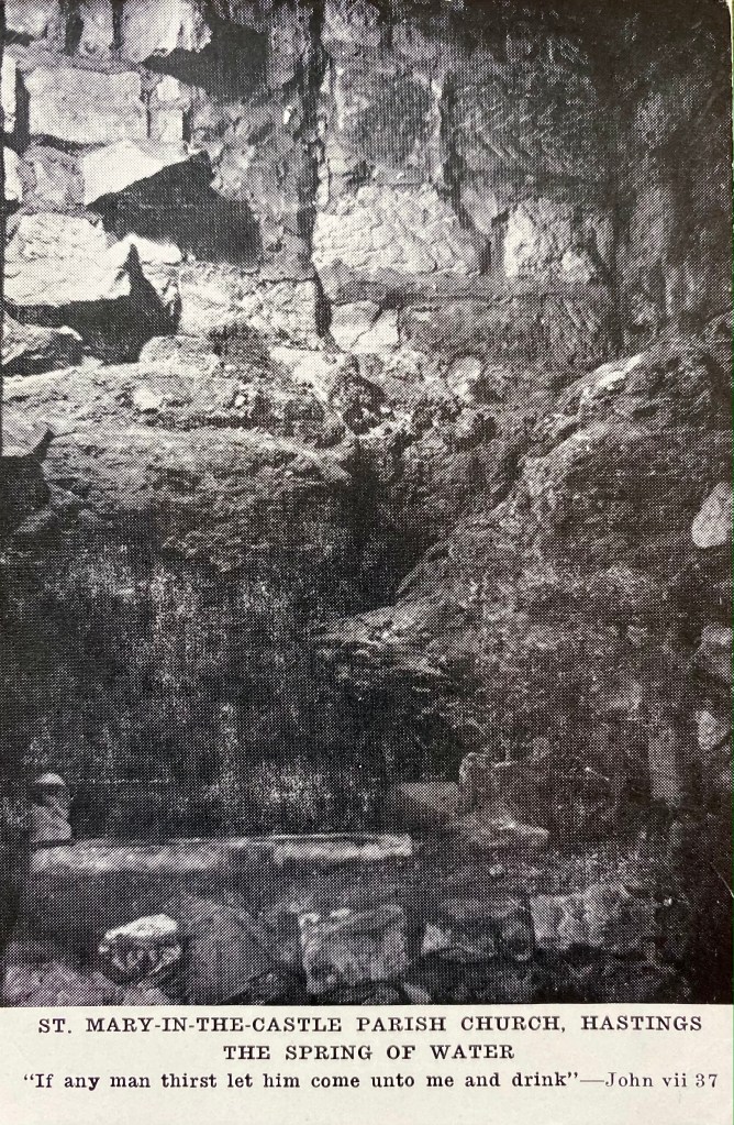 But this church, which is literally built into the cliff behind, hides a secret in its depths. In the vaults there is a spring which, in the early twentieth century, was converted to a full immersion baptism font. There is very little photographic evidence of the working font, but I have managed to source a photograph (courtesy of St. Mary in the Castle) and a vintage postcard, which gives some idea of the spring being utilised in its heyday.
