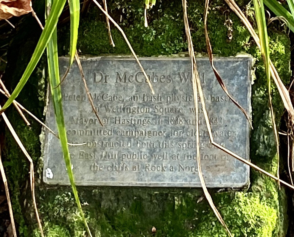 A few metres further on from the spring is an overgrown well that most people walk past without a second glance. However, on closer inspection, there is a half hidden plaque which states that “Peter McCabe, an Irish Physician based in Wellington Square was Mayor of Hastings 1838 and 1843, committed campaigner for clean water, he constructed both this spring and the East Hill public well the foot of the cliffs at Rock a Nore”